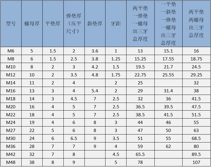基建施工過程中通常采購熱鍍鋅螺栓為國標(biāo)型,尺寸較為精準(zhǔn)統(tǒng)一。通過對(duì)各種型號(hào)螺栓的螺母、平墊、斜墊、彈墊、螺距的厚度進(jìn)行測量,得到以下列表。
