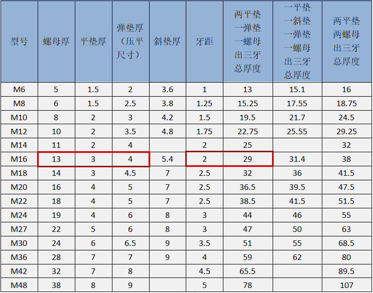 如M16熱鍍鋅螺栓,若采用兩平墊一彈墊一螺母出三牙的方式,則計(jì)算螺栓長H=3*2+4+13+2*3=29mm