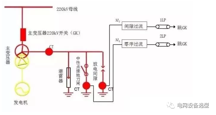 如下圖所示,為了避免由于過電壓從而將變壓器中性點(diǎn)絕緣性能損壞,所以,對(duì)于主變壓器中性點(diǎn)當(dāng)下最常采用的是裝設(shè)放電間隙的方法。此外,還在放電間隙回路裝設(shè)獨(dú)立的電流互感器,如此一來就組成了一個(gè)變壓器中性點(diǎn)放電間隙零序過電流保護(hù)。