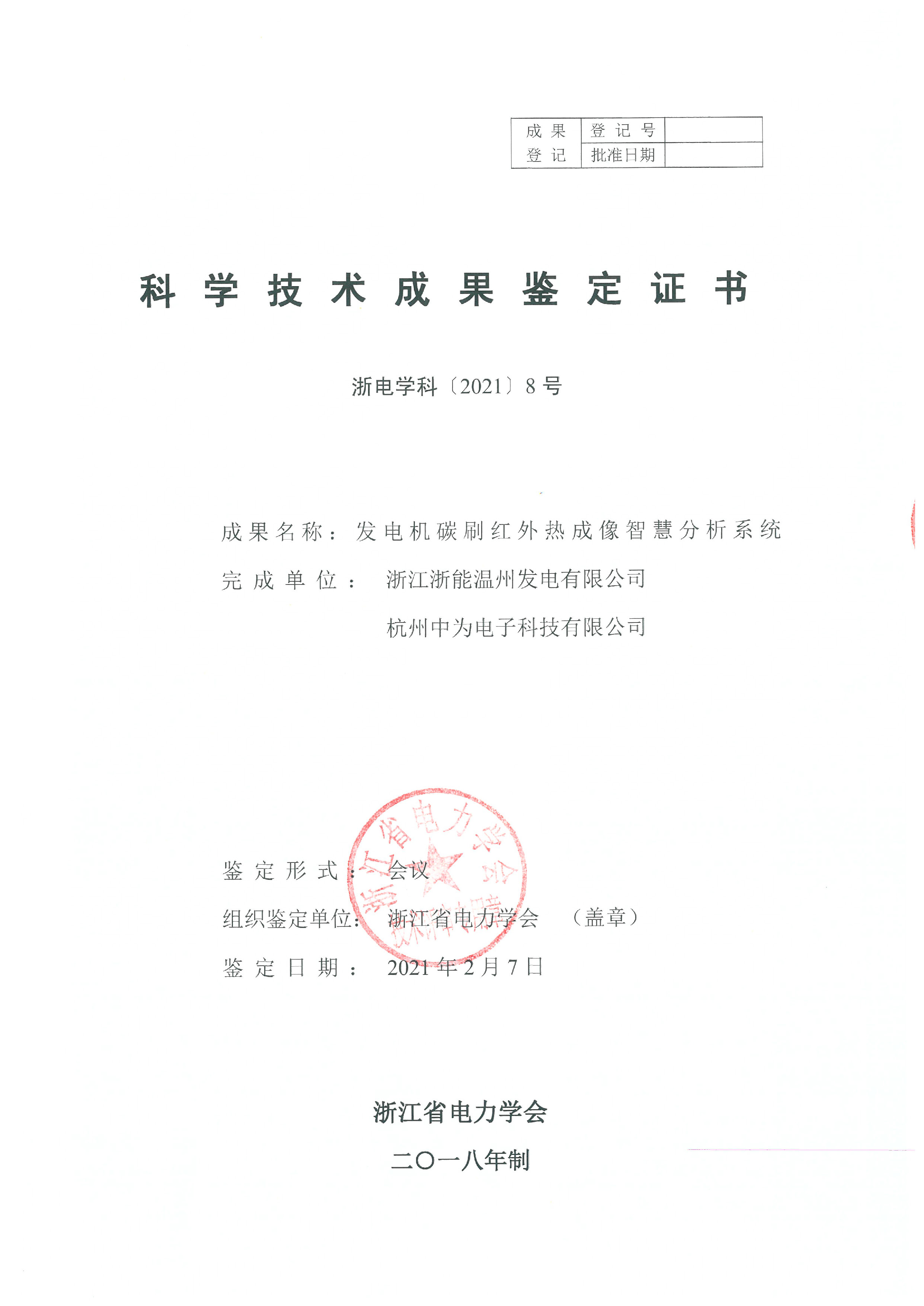 2021年2月7日,杭州中為電子科技有限公司牽頭浙江省電力學(xué)會相關(guān)專家在杭州市主持召開了浙江浙能溫州發(fā)電有限公司與杭州中為電子科技有限公司的合作項(xiàng)目《發(fā)電機(jī)碳刷紅外熱成像智慧分析系統(tǒng)》科技項(xiàng)目成果鑒定。經(jīng)鑒定委員會專家的鑒定,一致同意該科技項(xiàng)目通過科技成果鑒定。浙能溫州電廠技術(shù)總監(jiān)翁獻(xiàn)進(jìn)、杭州中為電子科技有限公司技術(shù)部潘明澤共同為委員會做專項(xiàng)成果技術(shù)介紹,詳盡的為與會專家闡述了項(xiàng)目的關(guān)鍵技術(shù)和創(chuàng)新點(diǎn)。