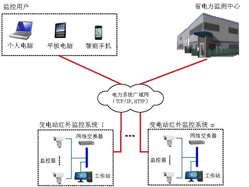 基于紅外熱成像的電力變電站遠(yuǎn)程監(jiān)控系統(tǒng)由全天候高性能雙通路監(jiān)控頭(紅外熱成像+CCD)與相應(yīng)的計(jì)算機(jī)網(wǎng)絡(luò)組成,系統(tǒng)采用了先進(jìn)的計(jì)算機(jī)壓縮技術(shù)與網(wǎng)絡(luò)傳輸技術(shù),只需通過RJ45標(biāo)準(zhǔn)以太網(wǎng)通訊接口,僅用“一根網(wǎng)線,一個IP地址”就可實(shí)現(xiàn)遠(yuǎn)程對雙視監(jiān)測器控制(焦距、溫度校正)、傳輸紅外和可見光視頻、傳輸測溫?cái)?shù)據(jù)、控制云臺。