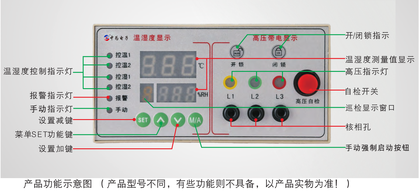 4、自檢開關(guān):顯示器電源接通后,無論高壓側(cè)是否帶電按下自檢開關(guān),顯示器自檢功能啟動,三相高壓燈點亮,閉鎖燈點亮,