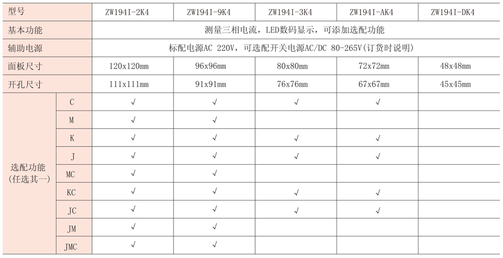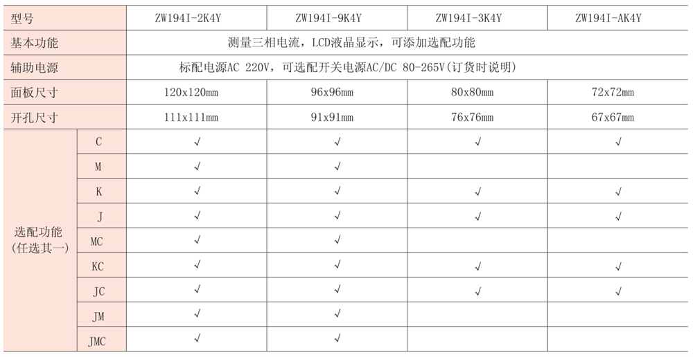 注:“√”代表可選配置,“J”代表報(bào)警輸出,“M”代表模擬量輸出,“K”代表開關(guān)量輸入,