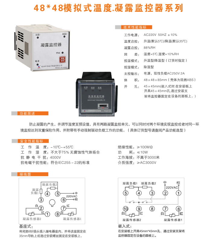 4.除凝露型:當測量濕度值大于88%RH時,啟動除凝露負載,當測量濕度小于75%RH時,關(guān)閉除凝露負載。